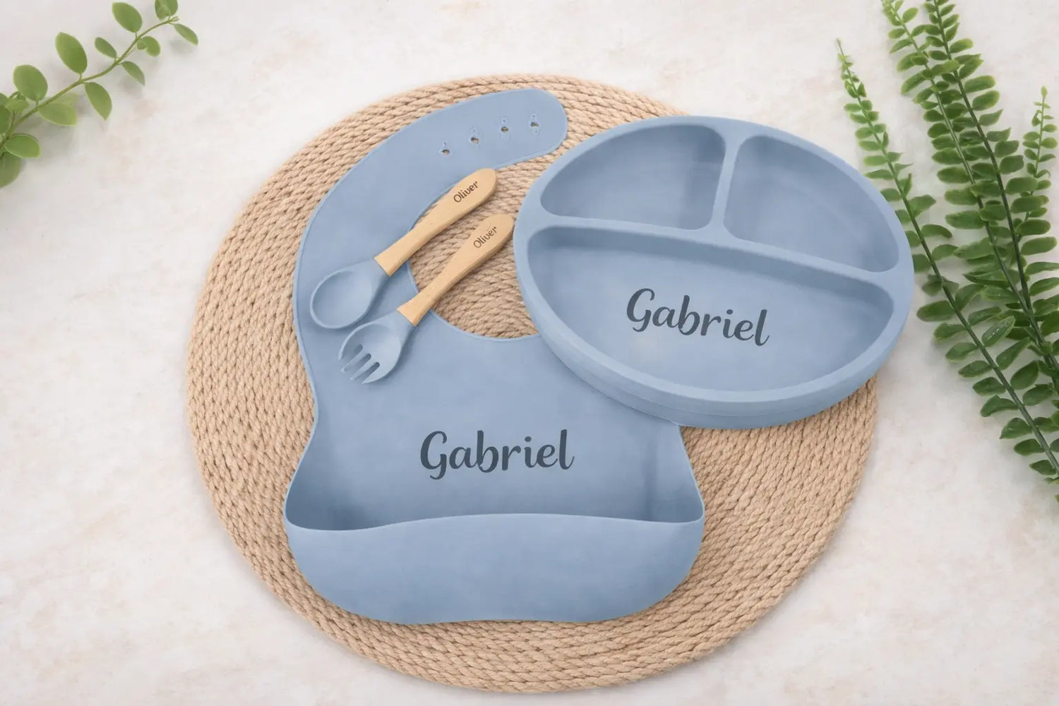 Personnalisation gratuite ● Silicone alimentaire sans BPA ● Facile à nettoyer ● Idéal pour les premiers repas